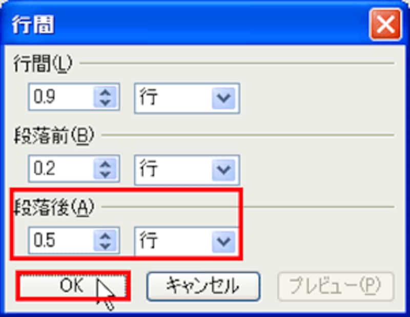 「行間」ダイアログボックスの「段落後」の数値を変更し、「OK」ボタンをクリックします。