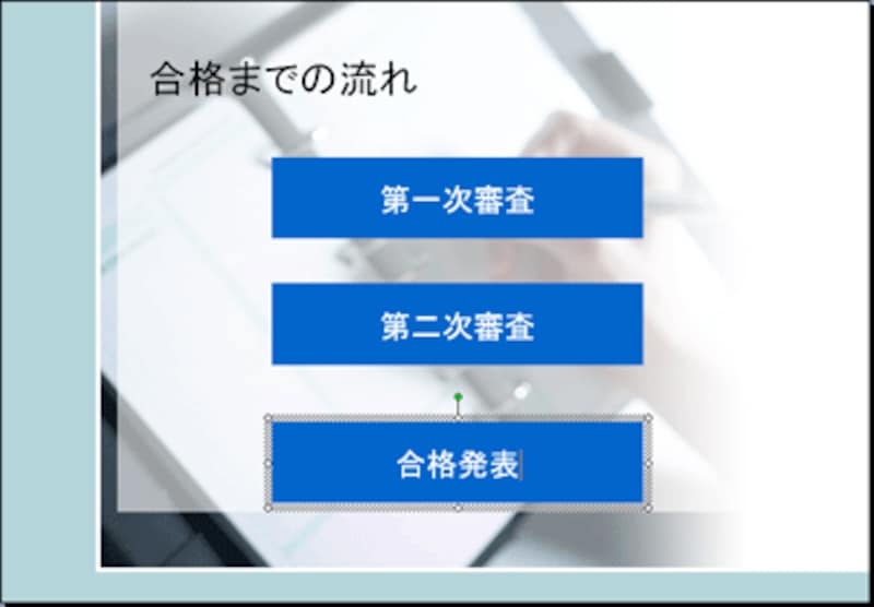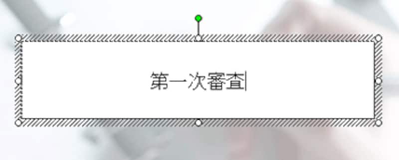 四角形の図形が描けたら、そのまま文字を入力します。四角形の周りに白いハンドルが表示されている状態でキーボードのキーを押すと、図形の中央に文字が表示されます。