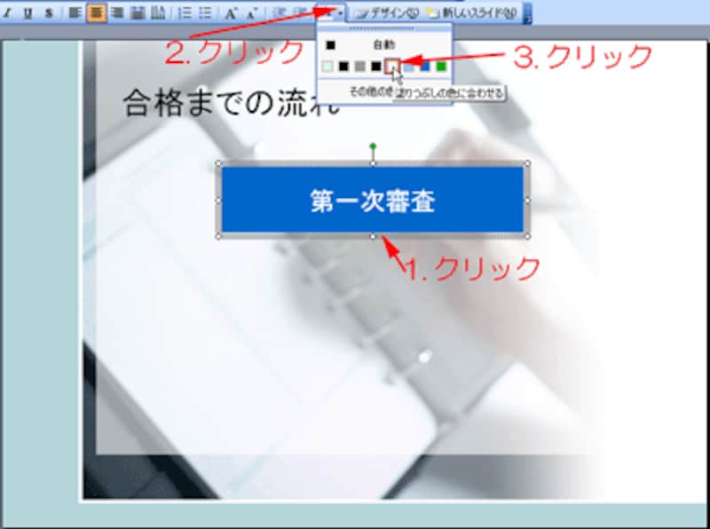 続けて、文字の書式も整えます。図形の色を濃くした場合は、「フォントの色」ボタンを使って文字の色を薄くしたほうがコントラストがはっきりして文字が読みやすくなります。この段階で、文字の大きさやフォントも調整しておきます。
