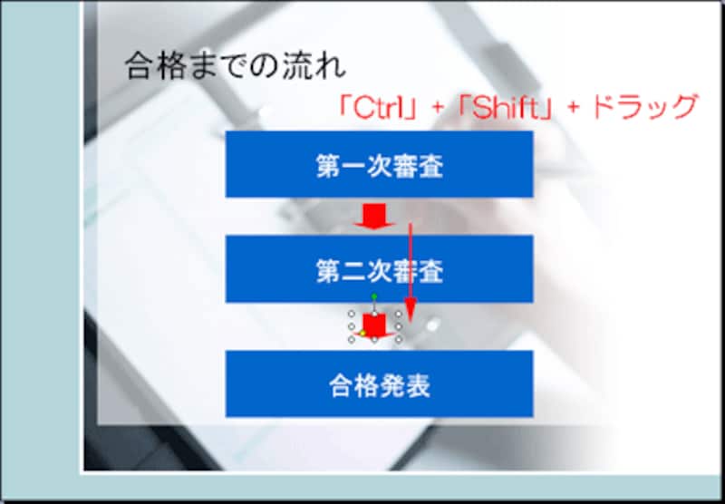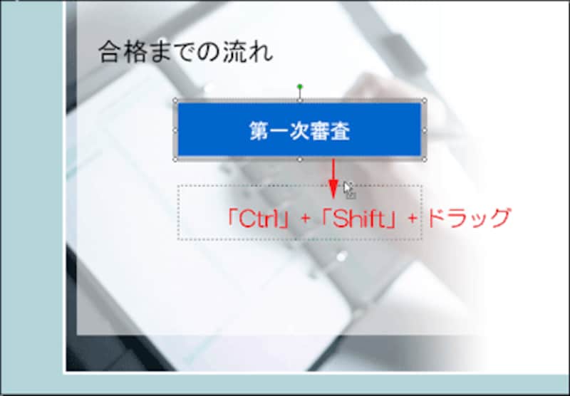 基本の図形がしっかりできたら、あとは、この図形を2つコピーするだけです。チャートを手早く作成する2つ目のコツは、キーボードとマウスを併用して図形のコピーと位置合わせを同時に行うことです。四角形をクリックして選択し、周りの網状の枠にマウスポインタを移動します。このまま、「Ctrl」キーと「Shift」キーを押しながら下方向にドラッグします。