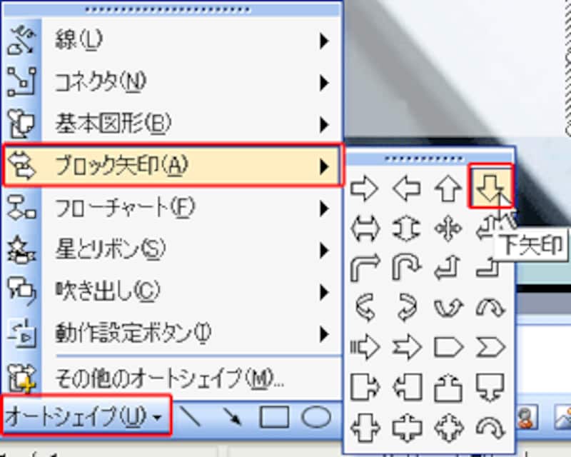 流れの方向を示す矢印の図形を追加しておくと、チャートが一層わかりやすくなります。手順は、四角形を描画したときと同じ。まず、「図形描画」ツールバーの「オートシェイプ」→「ブロック矢印」→「下矢印」をクリックし、1つ目の四角形と2つ目の四角形の間に矢印の図形を描画します。