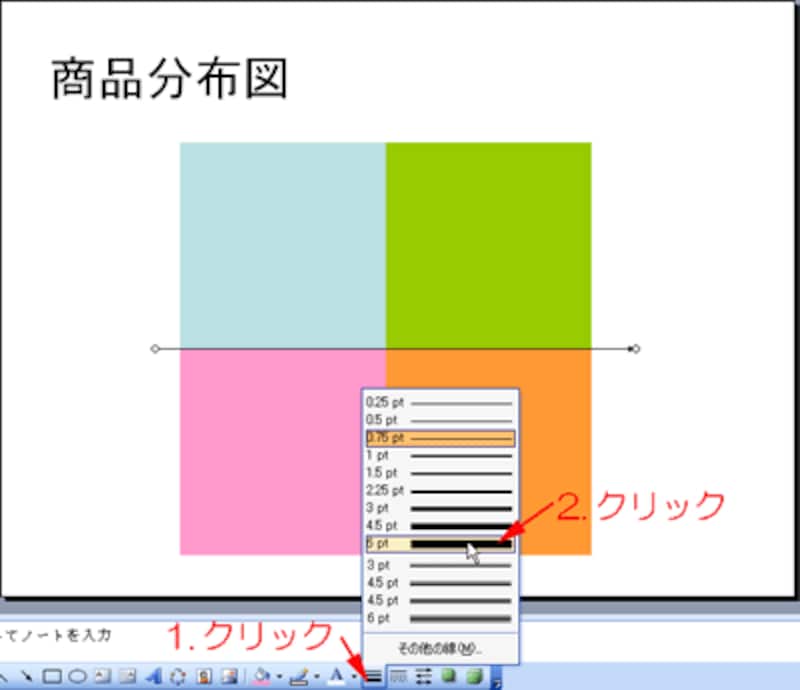 矢印の直線が描けましたが、このままでは弱々しい印象です。「図形描画」ツールバーの「線のスタイル」から、太い線をクリックして線の太さを変更します。