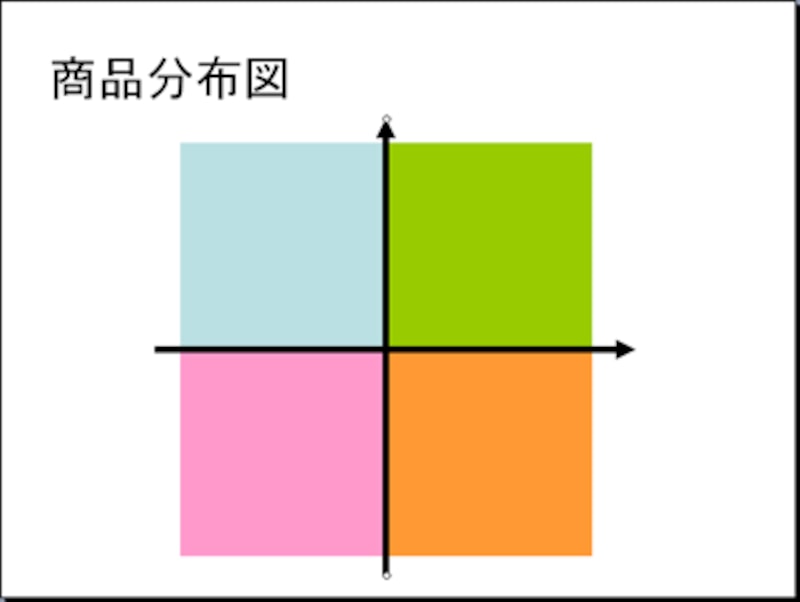 このままでは、4つの正方形が何を表しているのかがわかりません。矢印の図形とテキストボックスの図形を使って、区分の意味がわかるようにしてみましょう。「図形描画」ツールバーの「矢印」ボタンをクリックし、上下の正方形の間に横線を引くようにスライド上をドラッグします。このとき、「Shift」キーを押しながらドラッグすると、まっすぐな線が描けます。