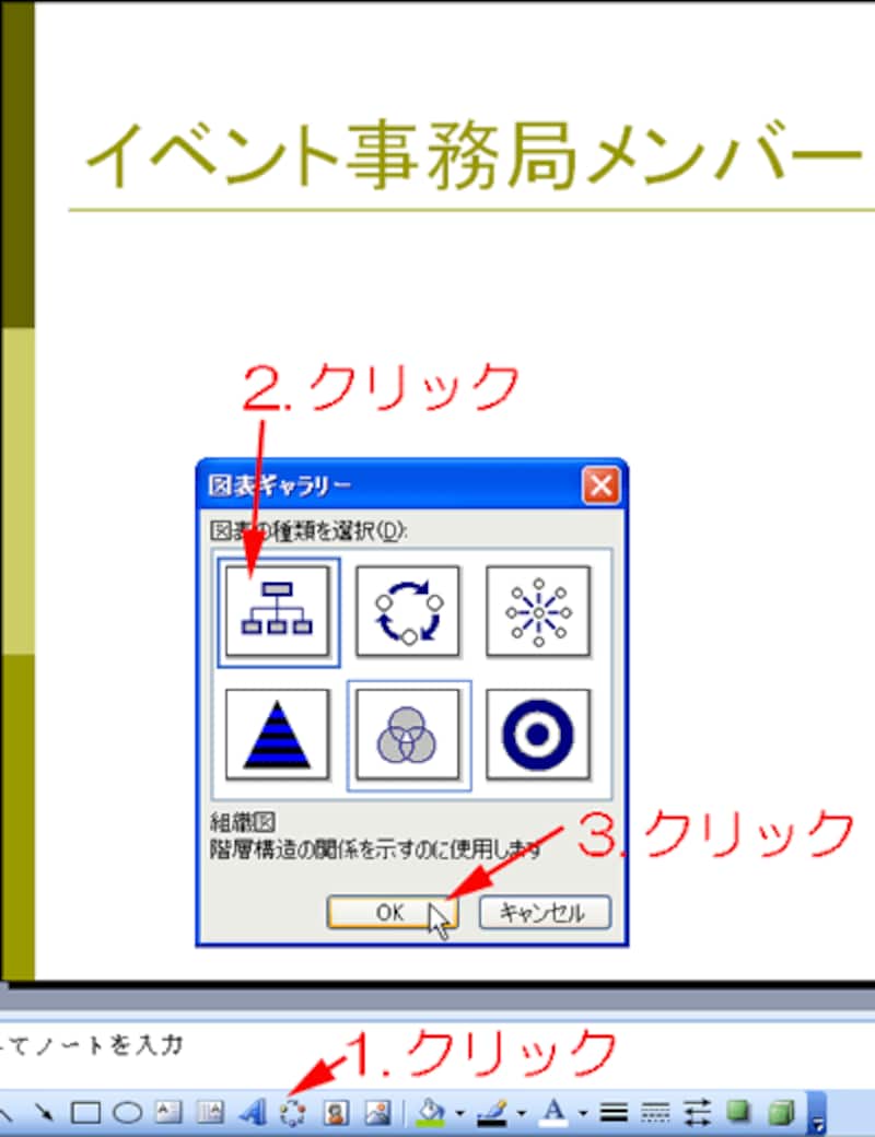 「図形描画」ツールバーの「図表ギャラリー」ボタンをクリックし、開く画面で「組織図」を選んで「OK」ボタンをクリックします。