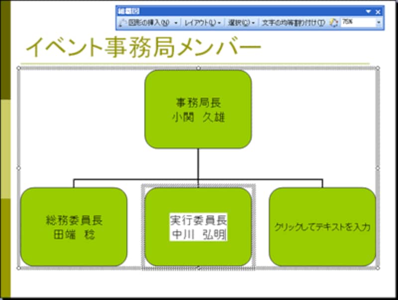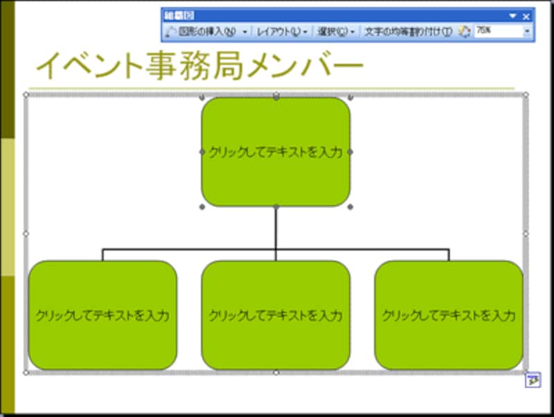 組織図を選んだだけで、スライドに4つの図形が表示されました。図形の中に文字を入力したり、図形を追加・削除しながら組織図を作成していく、というわけです。