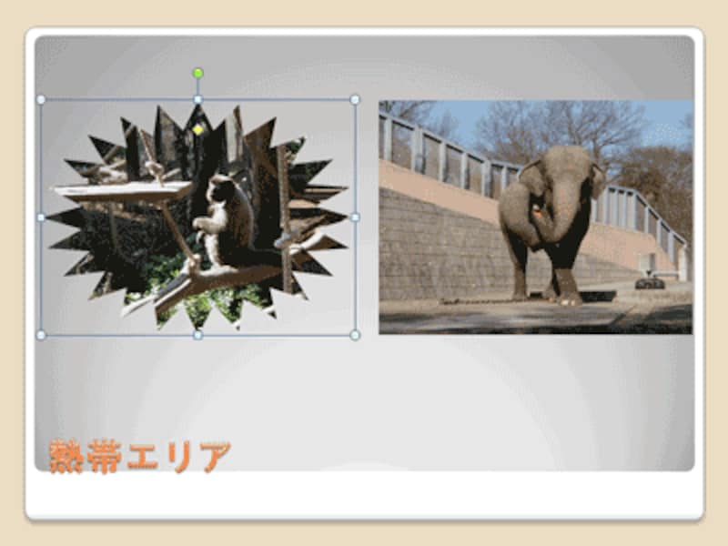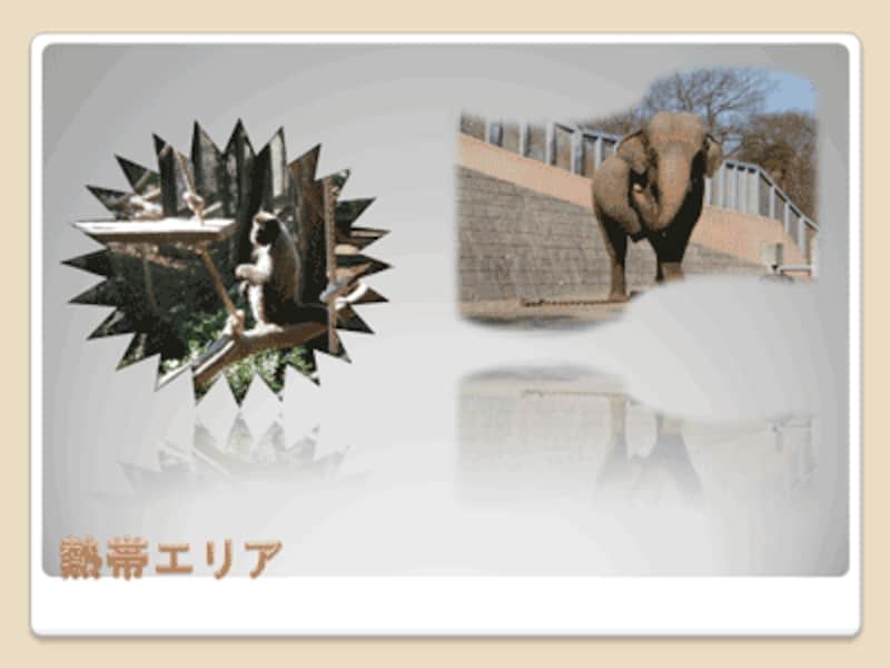 | 右側の象の写真は、フローチャートの形に切り抜いてから「ぼかし」と「反射」の効果を組み合わせた |