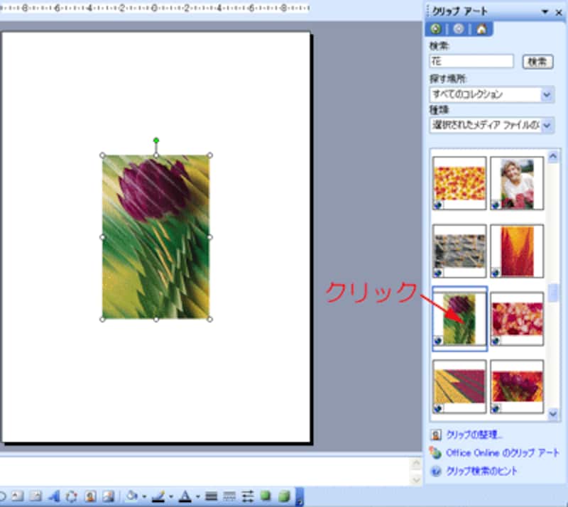 次はポスターのメインとなる写真を用意します。デジタルカメラで撮影した写真を使う場合は、あらかじめ名前を付けて保存しておきます。今回のポスターは写真が肝。「これ」といった写真がない場合は、Web上に公開されている写真をダウンロードして利用するのもひとつの方法です。ただし、その場合は著作権に触れないように十分注意してください。ここでは、PowerPointに付属するクリップアートの写真を利用する手順を紹介します。「図形描画」ツールバーの「クリップアートの挿入」ボタンをクリックし、画面右側に表示された「クリップアート」作業ウィンドウにキーワードを入力します。このまま検索すると、写真以外のイラストも検索され数が膨大になってしまうため、「種類」の▼ボタンをクリックし、「写真」以外のチェックを外しておくと便利です。
