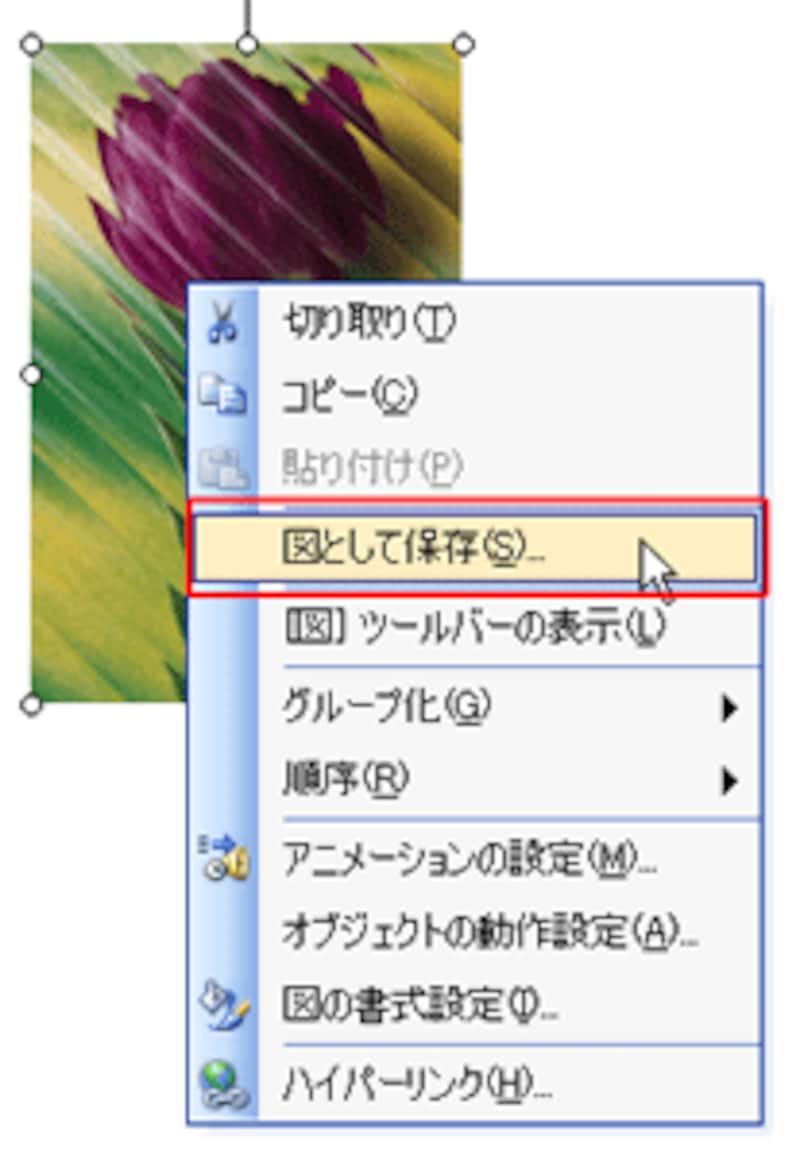 写真をスライド全体に大きく拡大して使うには、いったん、写真に名前を付けて保存する必要があります。スライド上の写真を右クリックして表示されるメニューから「図として保存」をクリックします。これは、Office製品の中でPowerPointだけにあるメニューです。