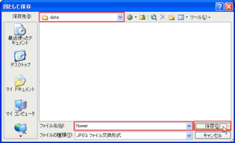 「図として保存」画面で、保存先とファイル名を入力し「保存」ボタンをクリックすれば、写真の準備は完了です。スライドに挿入した写真は、「Delete」キーで削除しておきましょう。なお、デジカメで撮影した写真やダウンロードした写真がすでにパソコンに保存されている場合は、上記の操作は必要ありません。