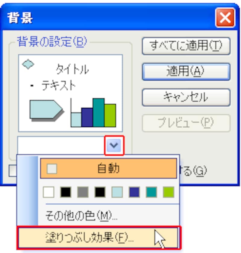 保存した写真をスライドの背景として使う操作は、「魅力的な表紙スライドの作り方(背景写真)」の記事で紹介した通り。「書式」メニューの「背景」をクリックし、「背景」画面が表示されたら、▼ボタンをクリックし、一覧から「塗りつぶし効果」をクリックします。![]() |