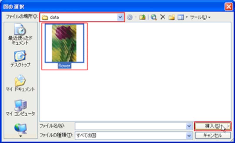 「塗りつぶし効果」画面が表示されたら、「図」タブの「図の選択」ボタンを押し、写真の保存先とファイル名を選択して「挿入」ボタンをクリックします。