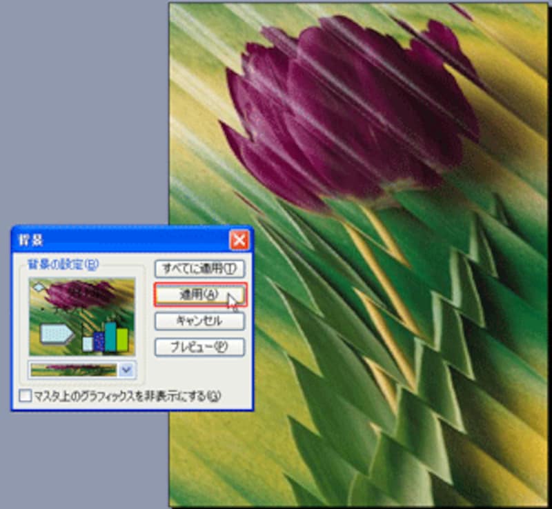 「塗りつぶし効果」画面で「OK」ボタン、「背景」画面で「適用」ボタンをクリックすると、スライドの背景に写真が表示されました。