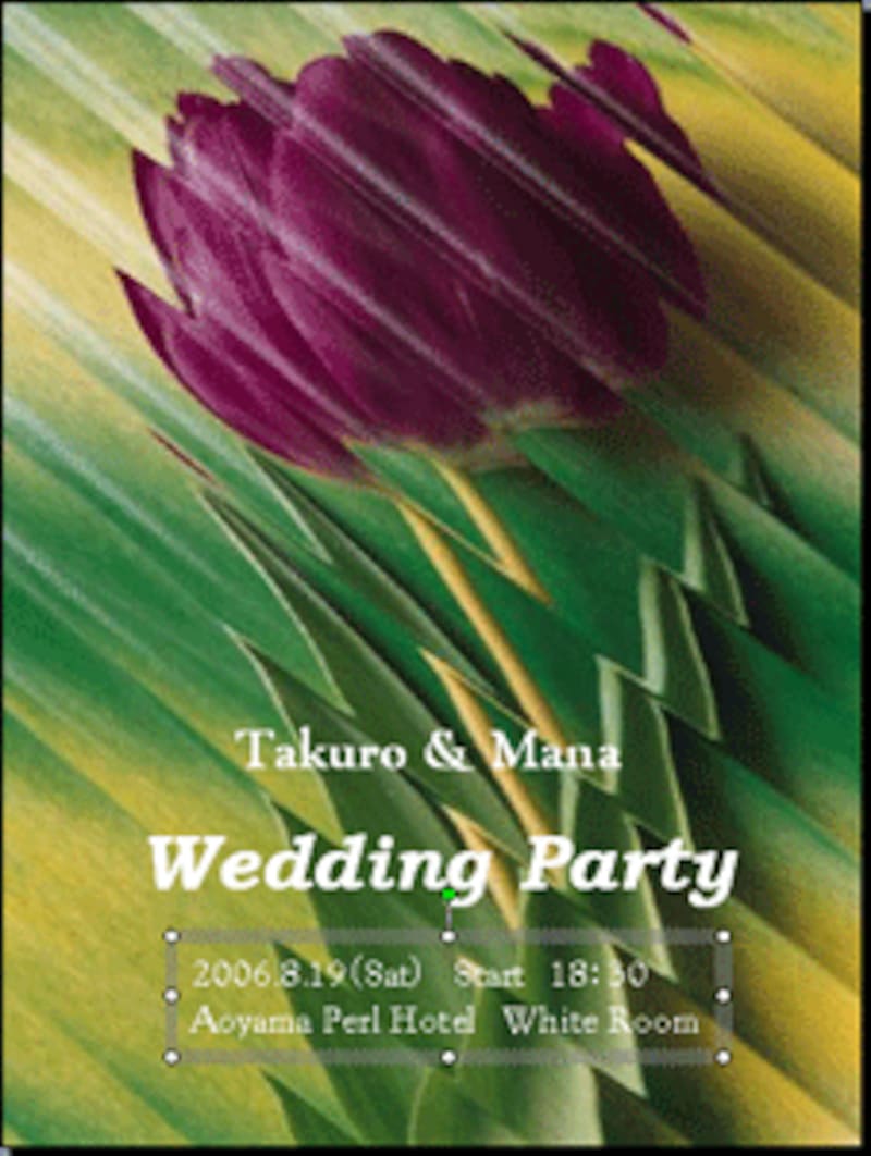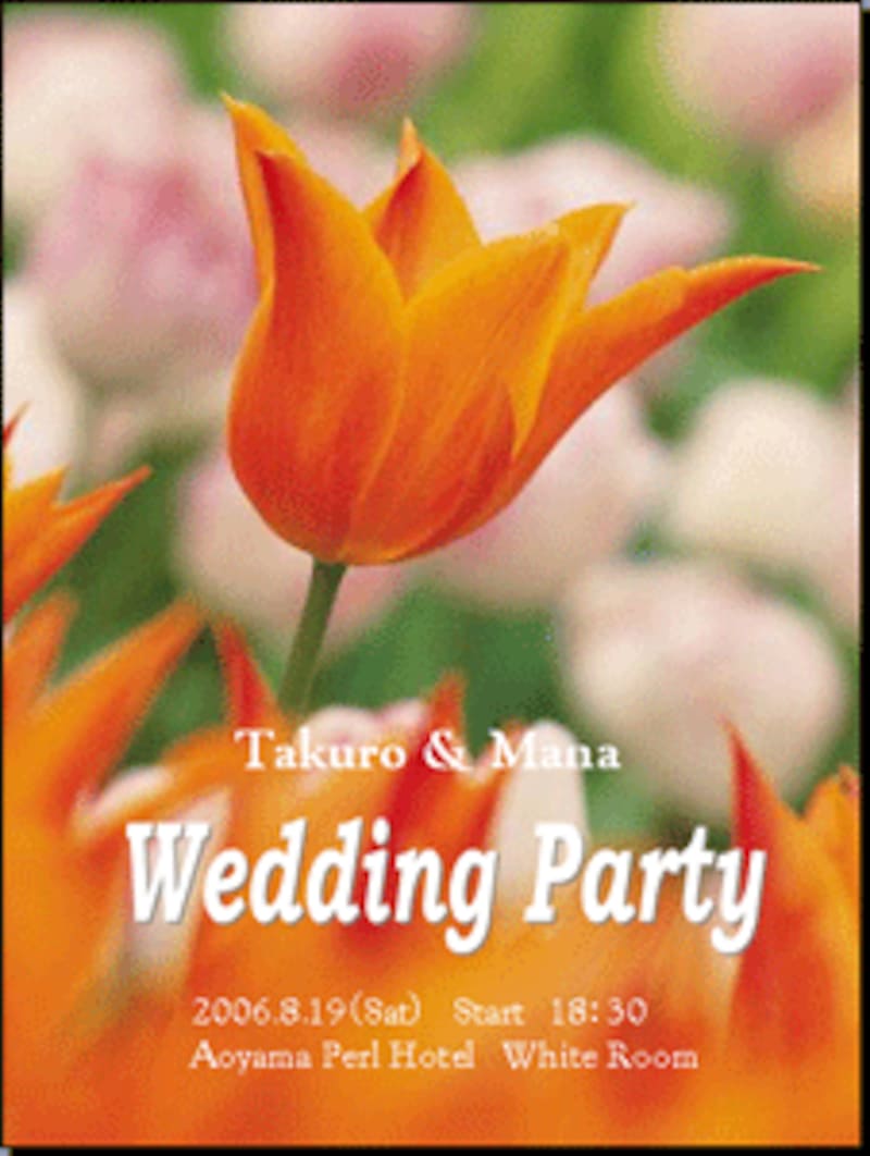 最後に、写真と文字だけで作成したほかのポスターの例をも紹介しておきましょう。同じウェディングパーティーのポスターでも写真を変えるだけで随分雰囲気が変わりますね。