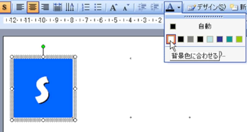 図形や文字の見栄えを整えておきましょう。図形の色は「図形描画」ツールバーの「塗りつぶしの色」、図形の枠線は「線の色」ボタン(ここでは「なし」を選択)、文字のサイズやフォントや色は、「書式設定」ツールバーの「フォントサイズ」ボタンや「フォント」ボタンや「フォントの色」ボタンからそれぞれ設定します。