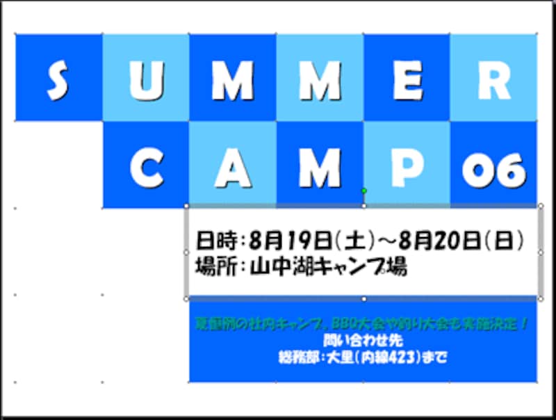 日時や問い合わせ先が入力されている部分も、横長の四角形を描画して文字を入力しただけです。日時の四角形の色を「白」にすることで、スライドの背景に溶け込むようにしました。