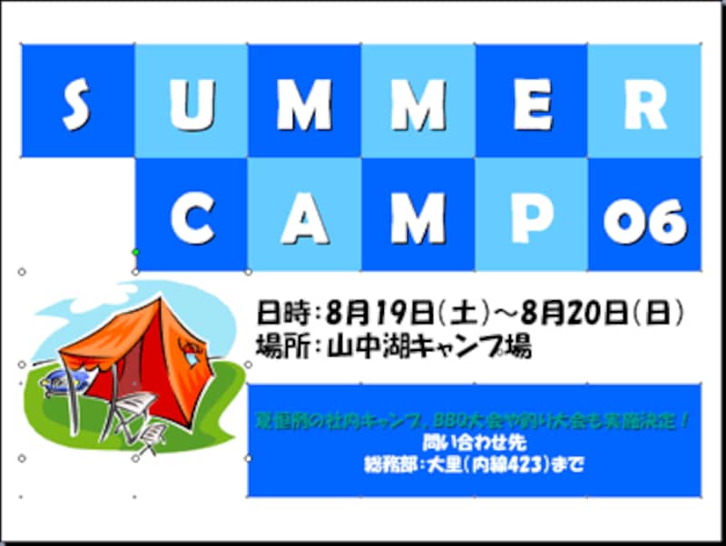 最後に、PowerPointに付属するクリップアートで内容にあったイラストを挿入すれば、ポスターの完成です。クリップアートの使い方は、「写真と文字だけで作るシンプルなパワポのポスター」の記事を参考にしてください。![]() |