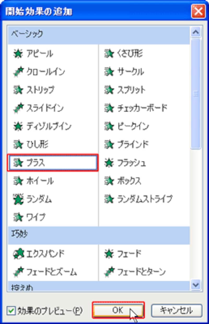 今回は、「ベーシック」のグループの中から「プラス」を選んで「OK」ボタンをクリックします。