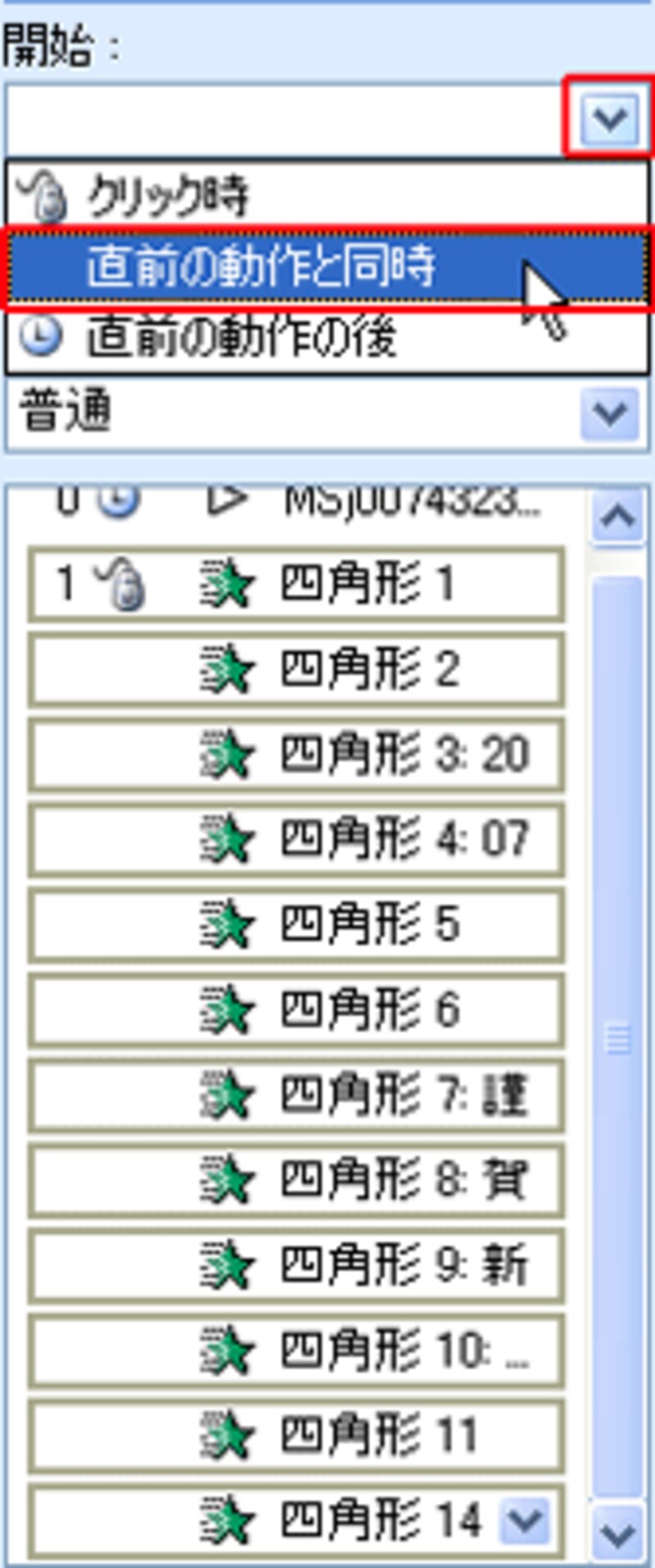 ただしこのままでは、スライドショーでスライドをクリックしないと四角形のアニメーションが動きません。クリックしなくてもサウンドを同時に自動的に表示されるように、「開始」の一覧から「直前の動作と同時」を選びます。