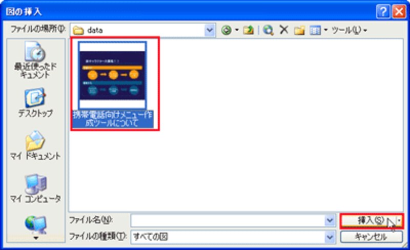 「図の挿入」ダイアログボックスで、スライドを画像として保存した場所とファイル名を指定して「挿入」ボタンをクリックします