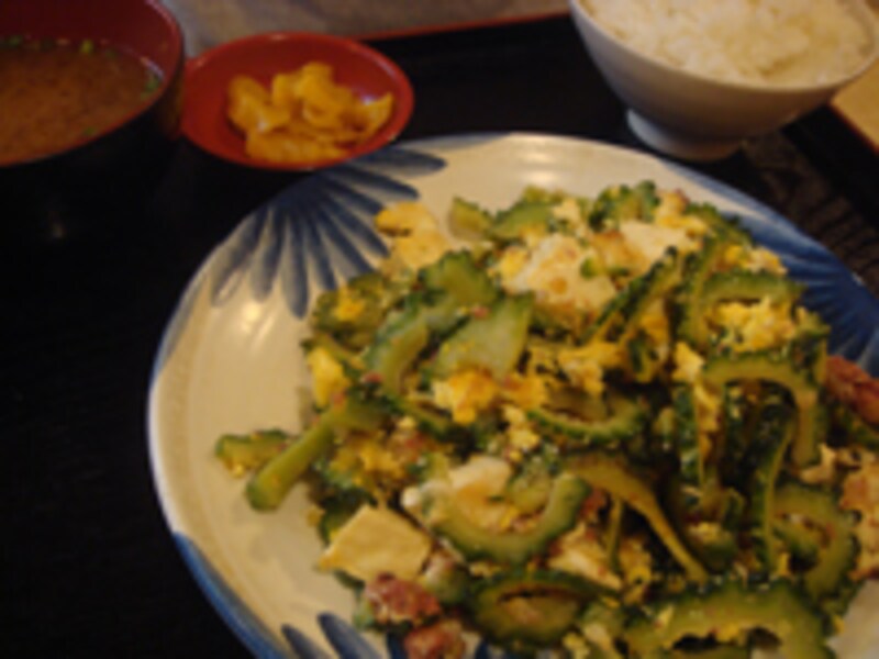 ●ゴーヤーのチャンプルー:豚肉、卵、豆腐などと一緒に炒めたものです。参考レシピはこちら。