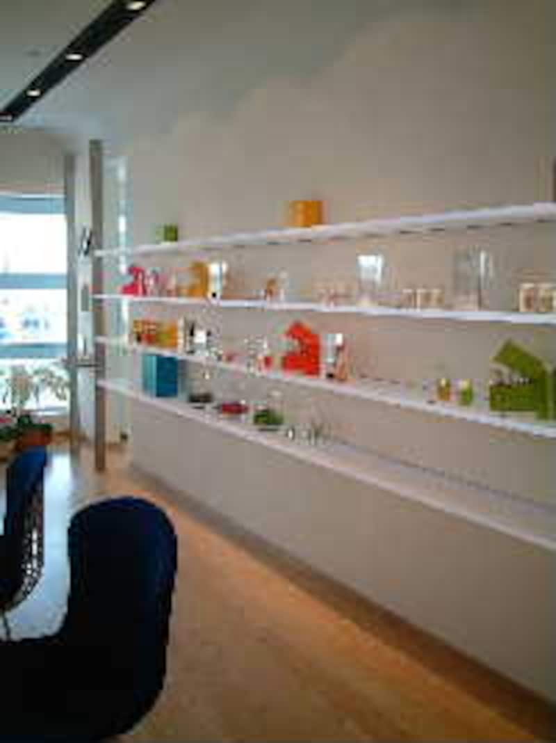 GWで最高級に込み合っているヒルズの中、たどり着いたのがウエストウォーク4Fの白を基調としたおしゃれなお店。入り口にはなにやら不思議な実験装置のような箱があります(右の写真。あとで聞いたところによると海洋深層水を冷却して巡廻させている機械とのこと)。