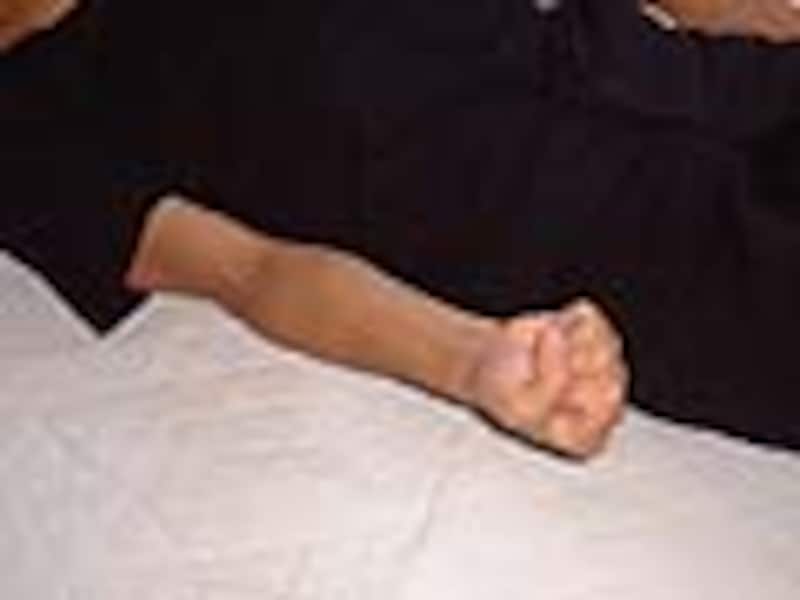 6. 手を楽に伸ばした状態で、右手のこぶしをギュッと握り締め、力を抜く。(下写真参照)