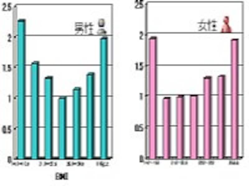 グラフにご注目ください。男性、女性ともBMIが19以下、30以上では死亡率が2倍近くに上がっています。もちろん太りすぎは健康によくないのですが、同じくらいやせすぎにも注意したほうがよいことがわかりますよね。
