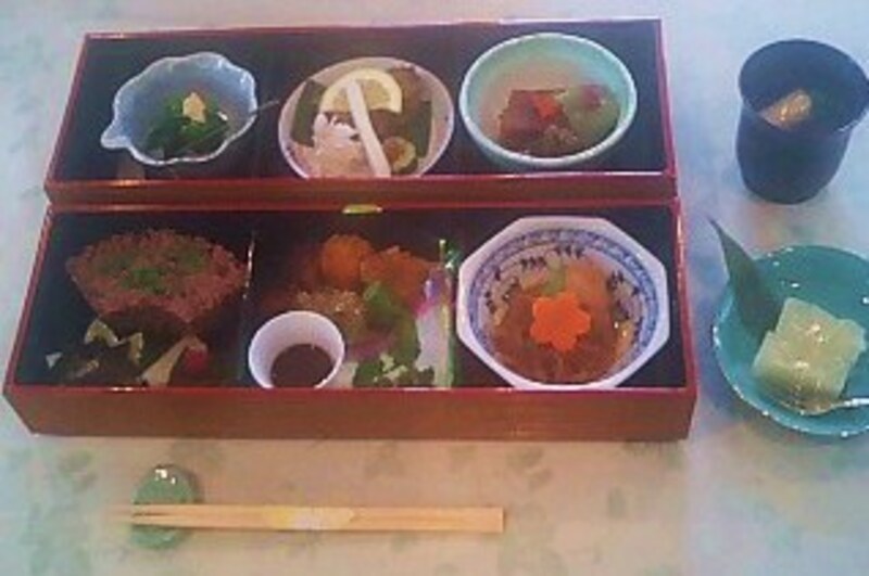(旬の野菜を中心にしたお弁当と玄米ごはん、味噌汁、デザート)