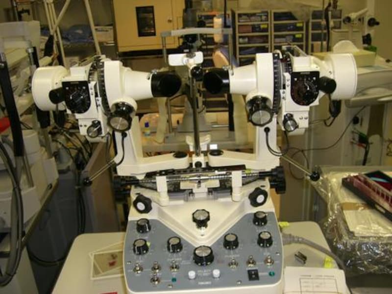 繊細な仕組みを持つ眼の状態を検査するためには、高度で精密な眼科検査機器が必要となります。今回は、眼科医院(横浜相鉄ビル眼科医院)の検査室を訪問させていただき、いくつかの検査装置の機能について大高功院長に分かりやすく説明していただきました。■血管の状態をみる蛍光血液撮影装置血管状態をみる装置<検査目的>眼球内の血液の流れや、血管の状態を調べる。眼は血管のかたまりであり、血液に質的な問題(ドロドロ・栄養不足など)があると、眼のように血管が集まっているところが悪くなりやすい。<検査のしくみ>蛍光ペンの液体のようなものを服用し、血管に色がついて状態がわかりやすくなるようにしたところを、この装置で撮影する。■網膜治療をするレーザー装置網膜治療をする装置<検査目的>網膜の治療を行う。糖尿病などで血管が悪くなり、酸素や栄養が血液に足りなくなると、新生血管が発生するようになる。<検査のしくみ>網膜にレーザーをあてて異常な血管を治療する。■斜視の角度を測るシノプト斜視の角度を測る装置<検査目的>斜視の角度を測る。斜視もその程度や状態に応じて、手術で治療することが可能です。最近ではテリー伊藤氏が手術を受けて話題となりました。<検査のしくみ>右を左と違う絵を見て、左右に見える別々の画像をあわせる。視野の広さを測る装置■視野測定装置<検査目的>緑内障の患者などに対して、視野の広さを測る。<検査のしくみ>白く大きな半円球に向かい、見えているところ、見えないところを測定する。このような検査機器もどんどん進化して、さらに詳細で緻密な目の状態が把握できるようになっているそうです。目に違和感や異常を感じたら、ぜひ早めの受診を試みてくださいね。記事協力:横浜相鉄ビル眼科医院、大高功(おおたか・いさお)院長 <白内障シリーズ>【第1回】白内障とは?【第2回】白内障になりやすい人とは?【第3回】白内障をどう治す?【第4回】現役医師に聞く! 白内障手術Q&A【目の健康 オススメ人気記事】 1位: 「乱視とは? 自分でできるセルフチェック」 2位: 「まぶたのピクピクを治すには?」 3位: 「オフィスで1分!癒しの無料動画」 4位:「3分間ツボ刺激が疲れ目に効く!」 5位:「 【目の美容】あなたの目のくまタイプは?」※記事内容は執筆時点のものです。最新の内容をご確認ください。※当サイトにおける医師・医療従事者等による情報の提供は、診断・治療行為ではありません。診断・治療を必要とする方は、適切な医療機関での受診をおすすめいたします。記事内容は執筆者個人の見解によるものであり、全ての方への有効性を保証するものではありません。当サイトで提供する情報に基づいて被ったいかなる損害についても、当社、各ガイド、その他当社と契約した情報提供者は一切の責任を負いかねます。免責事項