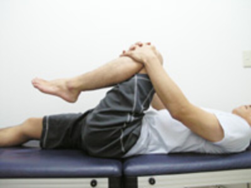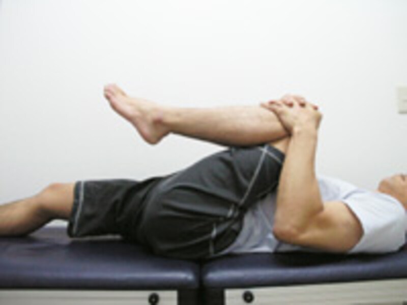 | 1 | 仰向けに寝た状態で、左ヒザを立てます。 | 2 | 深呼吸をしながら、ヒザに両手をかけて、ゆっくりと胸へ引き寄せます。 |