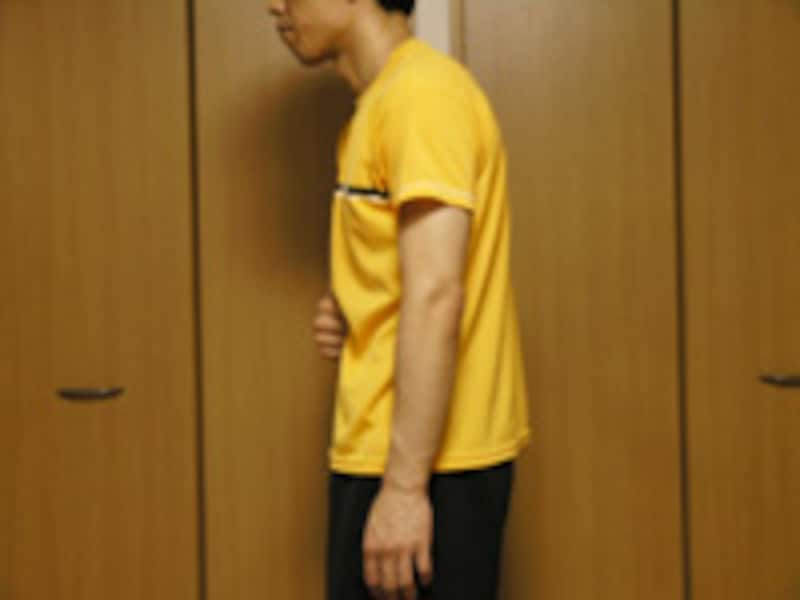 注意点は、見た目は腰を丸めているように見えますが、腰を意識をするのではなく、お腹に力を入れるだけです。写真では立ち姿勢で行っていますが、仰向けで寝た場合も同じ要領です。