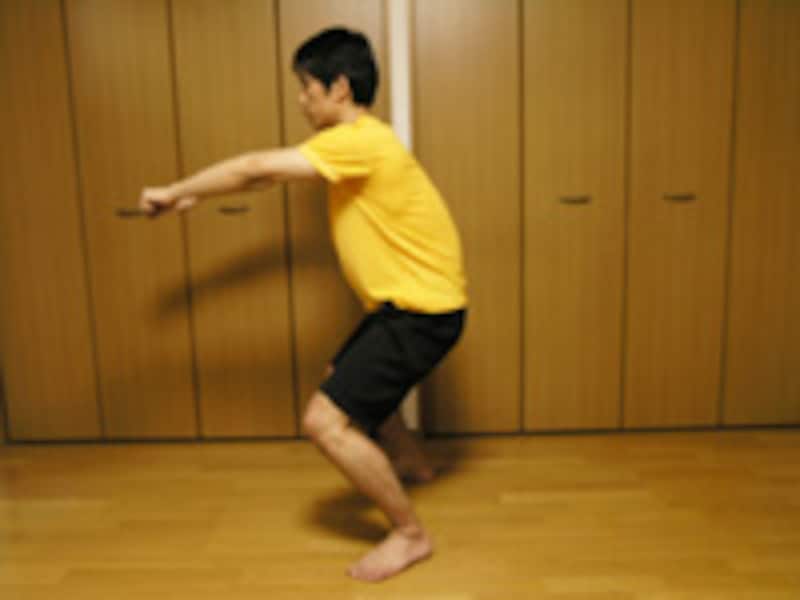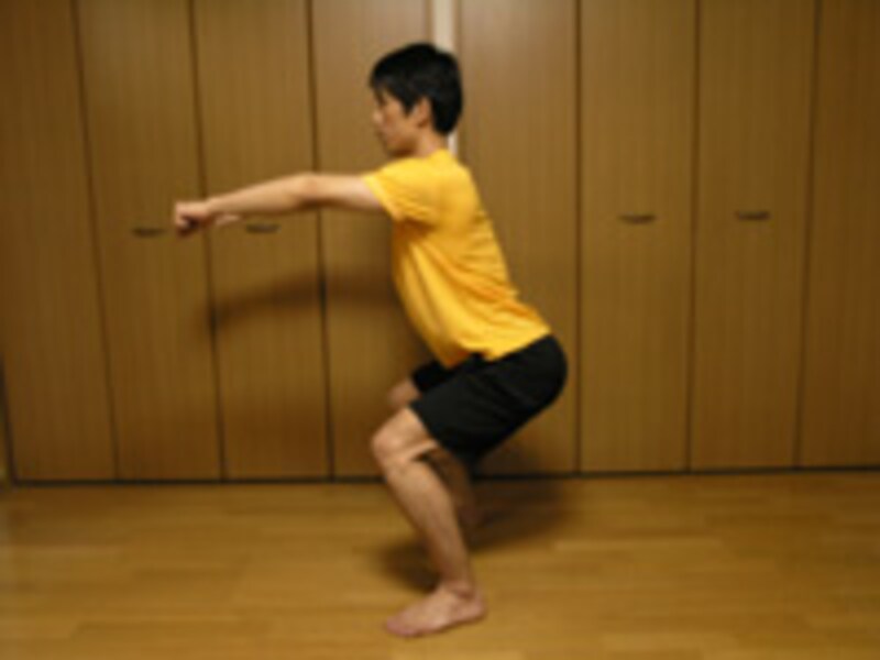 スクワットは、コツを掴んでいないと腰やヒザ、足首などに負担のかかる姿勢になりがちです。ただヒザを曲げていくだけでは、危険なスクワットになりやすいので要注意です。お尻を後ろへ突き出すイメージ(骨盤が前傾するように)で、顔は正面を向いたまま、お尻を下げていきましょう。体重を足のつま先へ乗せるとヒザへの負担が大きくなってしまいます。![]() | ![]() | ||
