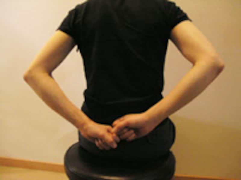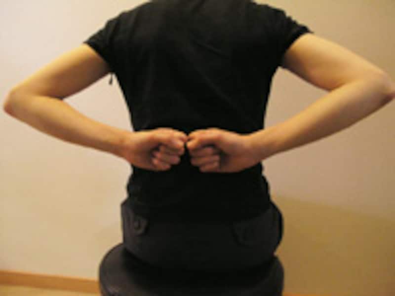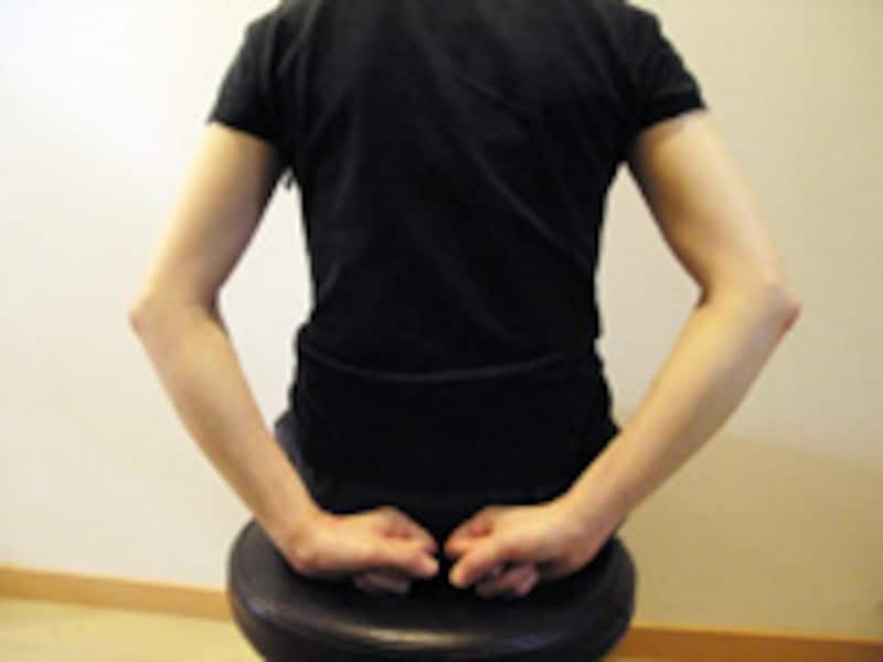 | 1 | イスに座り、手はイスへ触れる位置へ置き、お尻の線のすぐ脇をトントン軽やかに叩きます。叩く振動がその周囲へ広がるような気持ちの良い叩き方になるようにします。 | 2 | そのまま、叩く位置を上へずらしていきます。骨のある位置になりますが、あたりが痛ければ避け、気持ちが良いと感じる部分だけ刺激します。 |