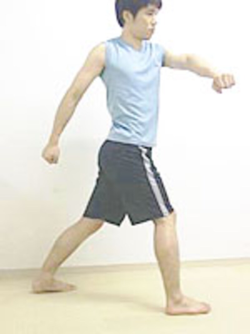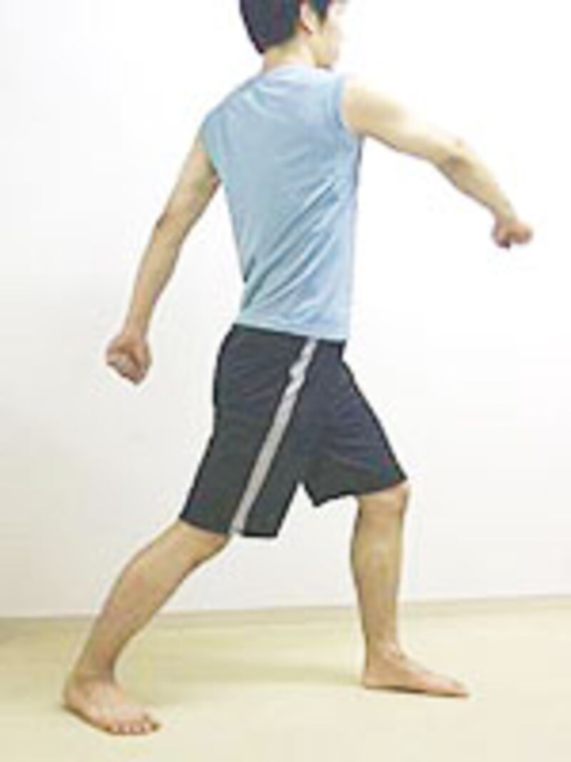 | 1 | 左足を大きく前に出し、右腕を大きく振る。 | 2 | 右足を大きく前に出し、左腕を大きく振る。 |