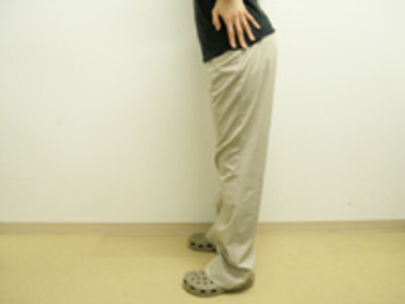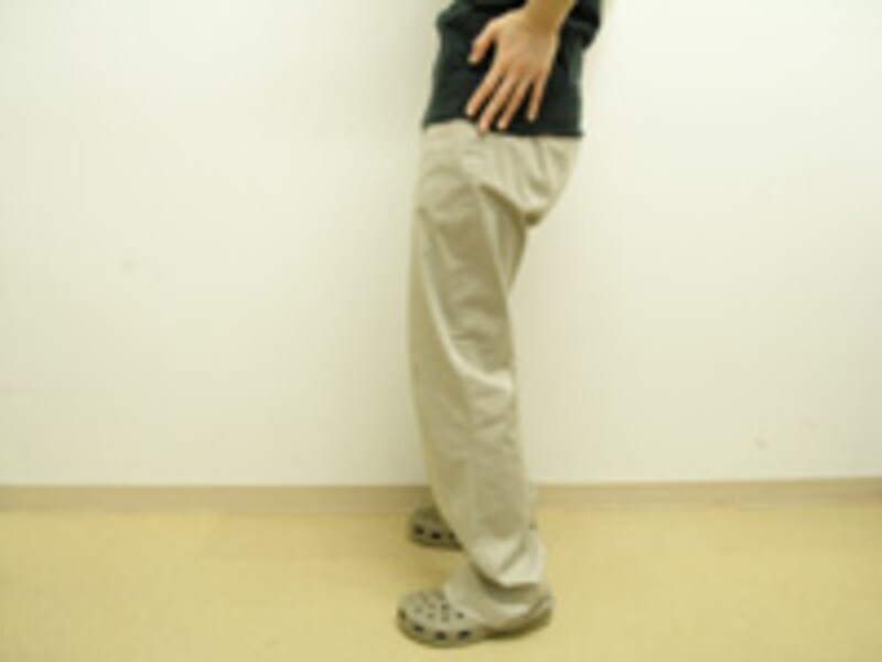 | 1 | 両足を軽く開いて立ちます。 | 2 | 指先を床方向へ向け、骨盤の横側に手を添えましょう。 |