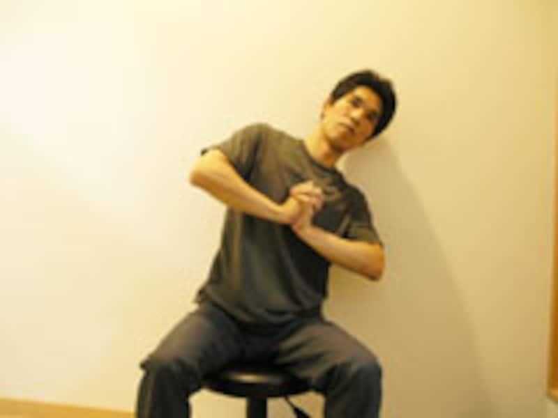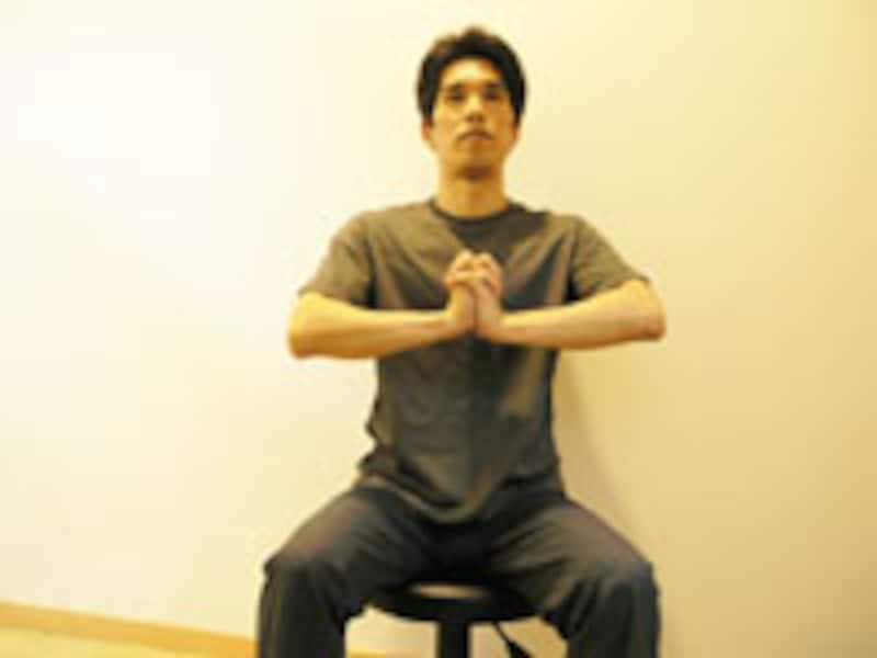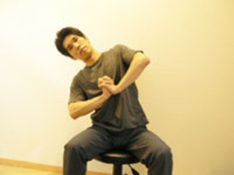 | 1 | 両手を胸の前で組み、腕が水平になるように肘を左右に張ります。 | 2 | 軽く両手を押し合うように力を入れながら、右肘を真下へゆっくりと移動させます。 |