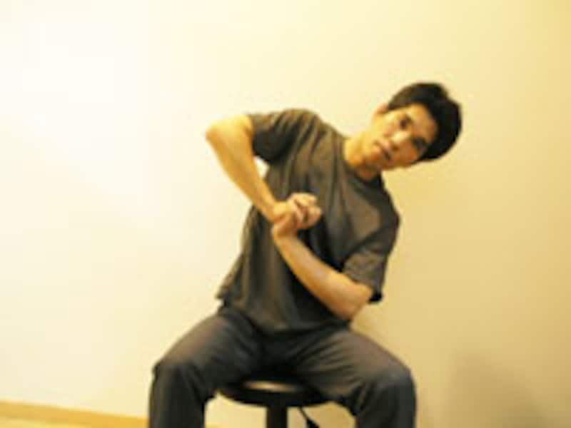 | 3 | 体の横側が伸ばされるのを感じながら、そのまま大きく深呼吸を2~3回します。 | 4 | 今度は反対側です。ゆっくり左肘を真下へ移動させます。 |