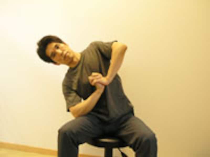 反動はつけずに、ゆっくりと行います。体の横側のつっぱり方はいかがでしょうか? 左右差はありましたか? 筋肉のつっぱりではなくて、背骨や骨盤のあたりが痛む場合は、無理には倒さないようにして下さい。