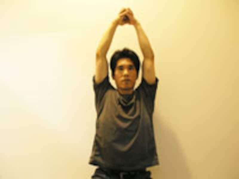 | 5 | 同様に、そのまま深呼吸を2~3回します。 | 6 | 可能であれば、最後に天井方向へ腕を伸ばすように、ぐ~っとストレッチをして、そこでも深呼吸を2~3回行ってみましょう。 |