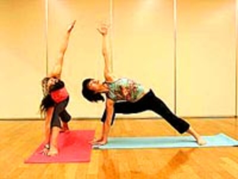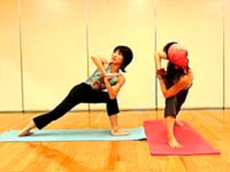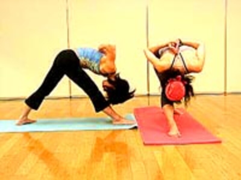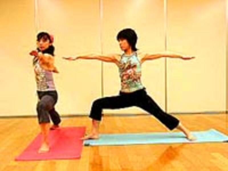 アクティブヨーガには、足を前後に開くポーズがありますが、上の写真1のように前後の足を前後に引張り体を支えるという意識は、ほとんどの動作で共通だそうです。