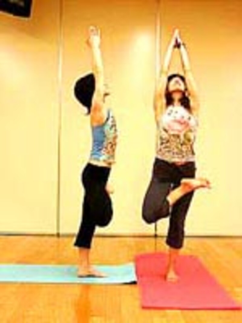 | 5 | 両手を背中に回し合掌する。両ヒザを伸ばし息を吸いながら上体を後ろに倒し胸を天井にむける。次に息を吐きながら上体を前に倒し、額をスネに近づける。 | 6 | 片足の甲をもう一方の足の付け根につけ、合掌し頭上へ伸ばす。片足立ちの足の裏全体で体重を支える。 |
