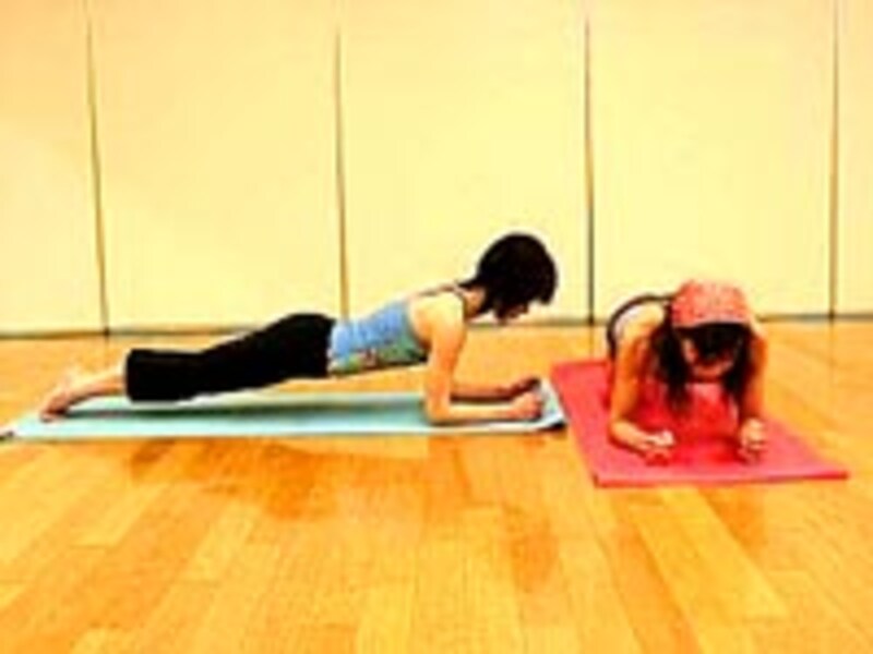 | 7 | 片手を床につき、もう一方の手は上方へ伸ばす。脇を引き上げ頭から足先まで一直線に保つ。 | 8 | 肩の真下に両ヒジをおき、お腹に力を入れ、お尻を引き締める。 |