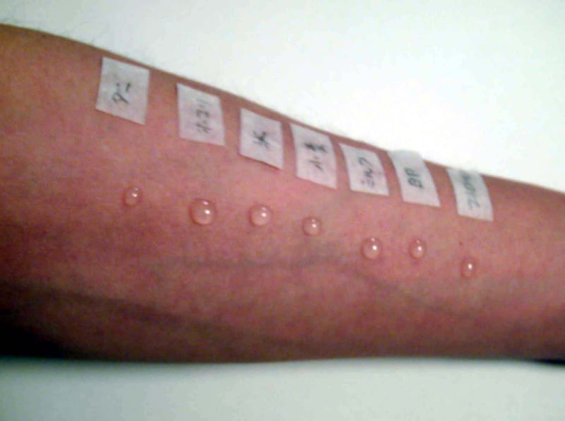 原因と思われるアレルギー物質を皮膚にたらして、針で少し皮膚を引っ掻きます。15分後に赤くなるか、蚊にかまれたような湿疹が出れば、たらしたアレルギー物質が原因と考えます。