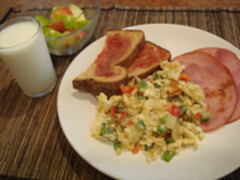 | スクランブルエッグにはマッシュルーム、ピーマン、玉ねぎを加えてボリュームアップ |