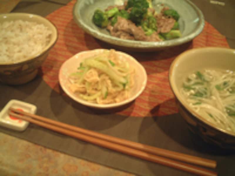 牛肉とブロッコリーの炒め物、えのきとわかめの味噌汁、雑穀米、きゅうりと干し大根の酢の物