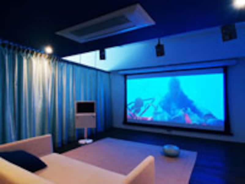 | シアターの大スクリーンが家のまん中!中古住宅+リノベーションなら、このような大胆な配置も可能。 |