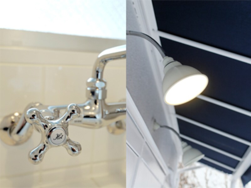 | 左:珍しい蛇口に注目! 右:ノスタルジックな雰囲気のランプが共用部を照らす。 |