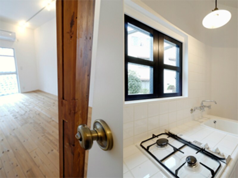 | 左:ドアノブはアンティーク風。古い柱から年月を感じられる。 右:白いタイルのキッチンには、フランス製のコンロ。 |