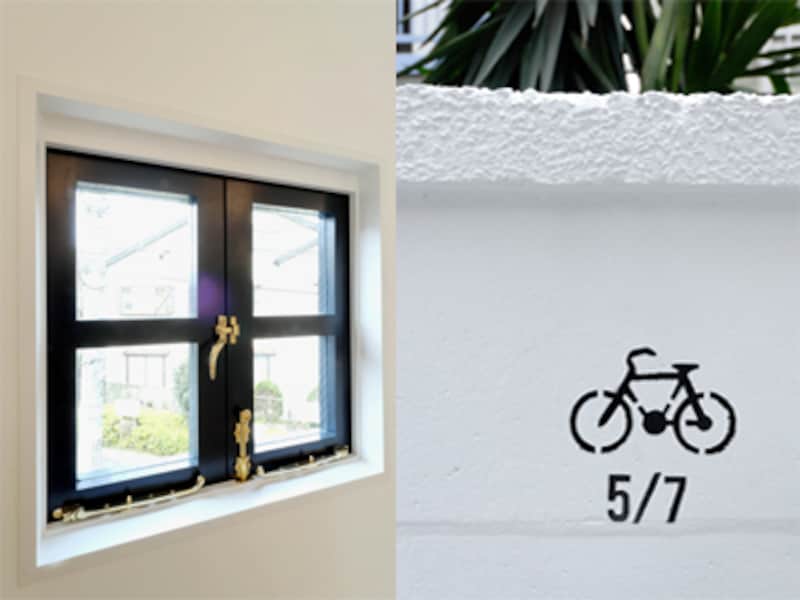 | 左:四角い窓枠は外観のアクセントにもなっている。 右:可愛らしい自転車のロゴマーク。1人1台駐輪場付き。 |