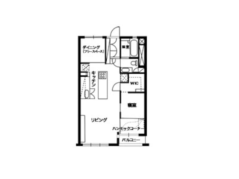 上の図は、リノベーション後のHさん宅の間取り図です。カーテンで仕切った蚊帳の中のような寝室は、バルコニーからの陽が届く明るい場所に。玄関ドアを入って右の空間はフリースペース。将来の子供部屋の候補として計画されました。